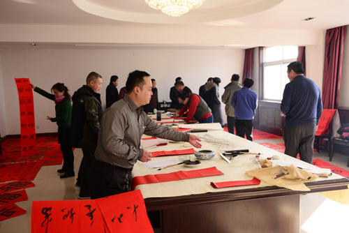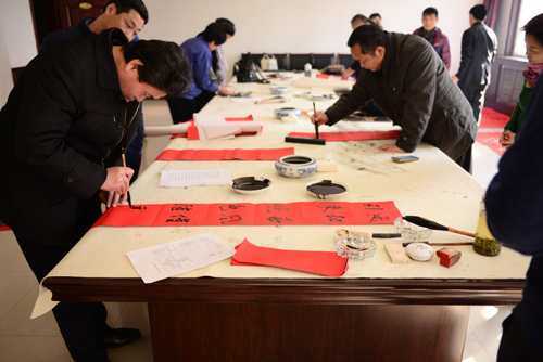活動現(xiàn)場精彩紛呈,書法家們揮毫潑墨,一幅幅精美的作品應(yīng)運而生,短短一上午時間,共書寫創(chuàng)作春聯(lián)及各類書法、繪畫作品近200幅。“風(fēng)光無限,無限風(fēng)光”、“白鶴飛來萬戶壽,金雞喚醒五湖春”、 “引來曙色隨雞舞;喚起春風(fēng)催馬馳”等,一幅幅火紅的春聯(lián),一幅幅精美的書法作品,表達了書法家們對企業(yè)的深深祝福,一組組佳句名言,凝聚了濟寧、汶上兩地文藝界助推企業(yè)發(fā)展的文化力量。