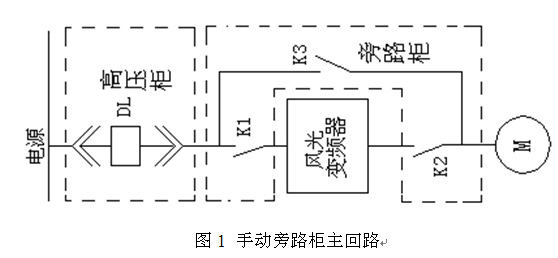 手動(dòng)旁路中,共有3個(gè)高壓隔離開關(guān)K1、K2、K3,當(dāng)K1、K2閉合,K3斷開時(shí),10kV電源經(jīng)隔離刀閘K1到高壓變頻裝置,變頻裝置輸出經(jīng)K2送至電動(dòng)機(jī),電動(dòng)機(jī)變頻運(yùn)行;一旦變頻裝置出現(xiàn)故障,可斷開隔離刀閘K1、K2,合上K3,在工頻電源下啟動(dòng)電機(jī)運(yùn)行,此時(shí)變頻器從高壓中隔離出來(lái),便于檢修、維護(hù)和調(diào)試。隔離刀閘K1、K2、K3之間具有閉鎖和防止誤操作功能。