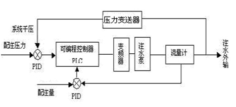 現(xiàn)場(chǎng)系統(tǒng)構(gòu)成框圖如圖3所示。系統(tǒng)閉環(huán)控制過(guò)程如下:由智能壓力變送器對(duì)各運(yùn)行注水泵進(jìn)行實(shí)時(shí)數(shù)據(jù)監(jiān)控和處理,即采集和傳輸注水泵、站的運(yùn)行參數(shù),如:泵的排量Q單、電機(jī)電流I、泵進(jìn)、出口壓力P泵,注水站出口干壓P干、總排量Q總、平均單耗等,并將這些控制參數(shù)(Q單、I、P泵、P干、Q總)與其期望值及泵本身的特性曲線進(jìn)行對(duì)比和優(yōu)化計(jì)算。其中,注水站干壓和總流量是系統(tǒng)所需監(jiān)測(cè)和控制的兩個(gè)最主要參數(shù)。本系統(tǒng)中,一方面在泵出口管線上安裝一只高可靠性壓力變送器,將實(shí)測(cè)的壓力信號(hào)與系統(tǒng)的配注壓力(期望值)相比,并將其差值送往過(guò)程參數(shù)調(diào)節(jié)器(PID)進(jìn)行比例和積分運(yùn)算,最后將輸出結(jié)果送給可編程控制器(PLC);另一方面在泵入口管線上安裝一只流量計(jì),用于監(jiān)測(cè)系統(tǒng)實(shí)際總流量,將該值與系統(tǒng)配注量的差值再進(jìn)行一次PID整定,最后將輸出結(jié)果送給PLC。PLC根據(jù)所接收的兩個(gè)PID整定信號(hào),利用模糊推理的方法,在滿足系統(tǒng)干壓的前提下,系統(tǒng)及時(shí)自動(dòng)調(diào)整高壓變頻器的輸出頻率從而控制變頻泵的轉(zhuǎn)速。由柱塞泵原理知,泵轉(zhuǎn)速的變化可引起相應(yīng)的排量變化,通過(guò)頻率的變化以達(dá)到期望的排量值。通過(guò)上述閉環(huán)控制,使系統(tǒng)的實(shí)際壓力和排量與系統(tǒng)的配注壓力和配注量相接近。系統(tǒng)設(shè)計(jì)為閉環(huán)控制系統(tǒng),流量和壓力為系統(tǒng)的兩個(gè)主要參數(shù),將系統(tǒng)實(shí)測(cè)的流量和壓力信號(hào)與地質(zhì)要求的流量和壓力(期望值)進(jìn)行雙PID調(diào)節(jié);通過(guò)模糊推理的方法自動(dòng)尋優(yōu)控制,根據(jù)推理結(jié)果,系統(tǒng)及時(shí)自動(dòng)調(diào)整高壓變頻器的輸出,并自動(dòng)計(jì)算出變頻器的較佳運(yùn)行頻率。