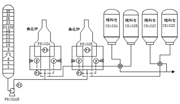 (1)對兩臺(tái)輻射進(jìn)料泵(P8102AB)進(jìn)行改造,采用一拖一手動(dòng)控制。