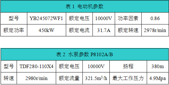輻射進(jìn)料泵(P8102AB)給焦化爐供應(yīng)原料,輻射進(jìn)料泵流程如圖1所示。輻射進(jìn)料泵(P8102AB)拖動(dòng)電機(jī)功率為450kW,額定電流為 31.7A,具體參數(shù)如表1、表2所示。