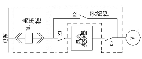 手動(dòng)旁路中,共有3個(gè)高壓隔離開關(guān)K1、K2、K3,當(dāng)K1、K2閉合,K3斷開時(shí),10kV電源經(jīng)隔離刀閘K1到高壓變頻裝置,變頻裝置輸出經(jīng)K2送至電動(dòng)機(jī),電動(dòng)機(jī)變頻運(yùn)行;一旦變頻裝置出現(xiàn)故障,可斷開隔離刀閘K1、K2,合上K3,在工頻電源下啟動(dòng)電機(jī)運(yùn)行,此時(shí)變頻器從高壓中隔離出來,便于檢修、維護(hù)和調(diào)試。隔離刀閘K1、K2、K3之間具有閉鎖和防止誤操作功能。