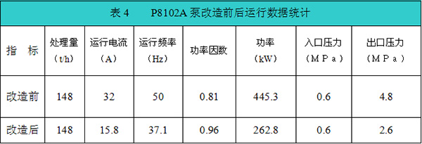 改造完成后,高壓變頻器于2013年6月20日一次投入使用,至今運(yùn)行正常。焦化裝置運(yùn)行穩(wěn)定的情況下,加工量為148t/h,原料配比和性質(zhì)穩(wěn)定,使泵輸送介質(zhì)的工況相對穩(wěn)定,泵的運(yùn)行情況良好,能夠滿足生產(chǎn)工藝要求。為檢驗(yàn)改造效果,以P8102A泵為例,對該泵改造前后運(yùn)行數(shù)據(jù)進(jìn)行統(tǒng)計(jì),如表4所示。節(jié)電效果十分明顯。操作壓力明顯降低。