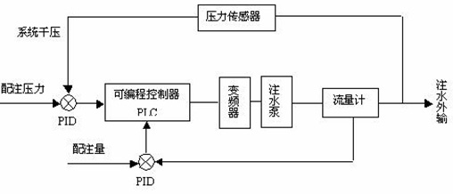 本系統(tǒng)中,一方面在泵出口管線(xiàn)上安裝一只高可靠性壓力傳感器,將實(shí)測(cè)的壓力信號(hào)與系統(tǒng)的配注壓力(期望值)相比,并將其差值送往過(guò)程參數(shù)調(diào)節(jié)器( PID )進(jìn)行比例和積分運(yùn)算,最后將輸出結(jié)果送給可編程控制器( PLC );另一方面在泵入口管線(xiàn)上安裝一只流量計(jì),用于監(jiān)測(cè)系統(tǒng)實(shí)際總流量,將該值與系統(tǒng)配注量的差值再進(jìn)行一次 PID 整定,最后將輸出結(jié)果送給 PLC 。 PLC 根據(jù)所接收的兩個(gè) PID 整定信號(hào),利用模糊推理的方法,在滿(mǎn)足系統(tǒng)干壓的前提下,系統(tǒng)及時(shí)自動(dòng)調(diào)整高壓變頻器的輸出頻率從而控制變頻泵的轉(zhuǎn)速。由離心泵原理知,泵轉(zhuǎn)速的變化可引起相應(yīng)的排量變化,通過(guò)頻率的變化以達(dá)到期望的排量值。通過(guò)上述閉環(huán)控制,使系統(tǒng)的實(shí)際壓力和排量與系統(tǒng)的配注壓力和配注量相接近。系統(tǒng)設(shè)計(jì)為閉環(huán)控制系統(tǒng),流量和壓力為系統(tǒng)的兩個(gè)主要參數(shù),將系統(tǒng)實(shí)測(cè)的流量和壓力信號(hào)與地質(zhì)要求的流量和壓力(期望值)進(jìn)行雙 PID 調(diào)節(jié);通過(guò)模糊推理的方法自動(dòng)尋優(yōu)控制,根據(jù)推理結(jié)果,系統(tǒng)及時(shí)自動(dòng)調(diào)整高壓變頻器的輸出,并自動(dòng)計(jì)算出變頻器的較佳運(yùn)行頻率。
