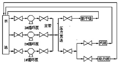浙江省衢州巨化硫酸廠(chǎng)是我國(guó)首批自己設(shè)計(jì)、制造、安裝的重點(diǎn)硫酸生產(chǎn)企業(yè),是浙江省較大的硫酸生產(chǎn)廠(chǎng)。在硫酸生產(chǎn)過(guò)程中,需要對(duì)水冷極板進(jìn)行冷卻,冷卻水循環(huán)泵是硫酸生產(chǎn)工藝中的重要設(shè)備,過(guò)去冷卻水循環(huán)泵均不調(diào)速,利用出口閥門(mén)來(lái)控制水流量和管網(wǎng)壓力,由于設(shè)備的選擇都是按最大負(fù)荷情況來(lái)選型,在實(shí)際運(yùn)行中設(shè)備留有較大的裕量,冷卻水的流量與壓力是通過(guò)冷卻水循環(huán)泵出、入口聯(lián)絡(luò)管上的調(diào)節(jié)閥來(lái)進(jìn)行調(diào)節(jié),造成電動(dòng)機(jī)運(yùn)行效率較低,造成電能浪費(fèi),為降低企業(yè)生產(chǎn)成本,廠(chǎng)家領(lǐng)導(dǎo)經(jīng)過(guò)反復(fù)論證,多方比較,決定選用我公司JD-BP37-280F型高壓變頻器對(duì)冷卻水循環(huán)泵進(jìn)行變頻調(diào)速節(jié)能改造,以解決能源浪費(fèi)問(wèn)題。用戶(hù)冷卻水循環(huán)泵的電動(dòng)機(jī)參數(shù)為6KV/280KW異步電動(dòng)機(jī),額定轉(zhuǎn)速985r/min,水泵參數(shù)為500S-35 單級(jí)雙吸離心泵。冷卻水循環(huán)泵工作原理如圖2所示,三臺(tái)循環(huán)泵兩開(kāi)一備。