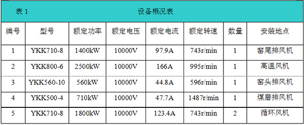 在風(fēng)機(jī)改造過程中,高溫風(fēng)機(jī)(2500kW/10kV、1套)采用“一拖一”控制加自動(dòng)旁路柜,窯頭排風(fēng)機(jī)(560kW/10kV、1套)、窯尾排風(fēng)機(jī)(1400kW/10kV、1套)、煤磨排風(fēng)機(jī)(710kW/10kV、1套和循環(huán)風(fēng)機(jī)(1800kW/10kV、2套)采用“一拖一”控制加手動(dòng)旁路柜。