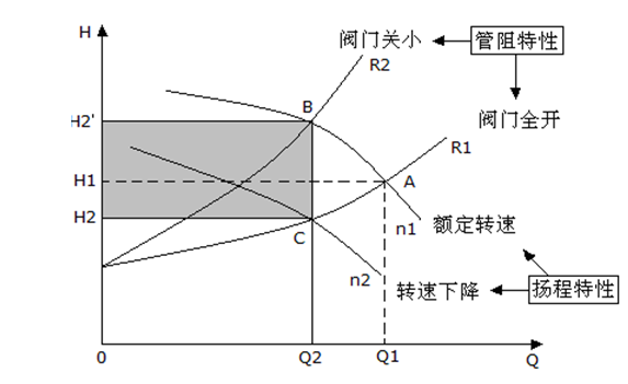 直觀的水泵(或風(fēng)機(jī))工作曲線圖見圖1:水泵(或風(fēng)機(jī))的正常工作點(diǎn)為A,當(dāng)水量(或風(fēng)量)需要從Q1調(diào)到Q2時(shí),采用閥門調(diào)節(jié),管網(wǎng)特性曲線由R1(閥門全開)改變?yōu)镽2(閥門關(guān)小),其工作點(diǎn)調(diào)至B點(diǎn),其功率為OQ2BH2’所圍成的面積,其功率變化很小,而其效率卻隨之降低。當(dāng)采用變頻調(diào)速時(shí),可以按需要升降電機(jī)轉(zhuǎn)速,改變?cè)O(shè)備的性能曲線,圖中從n1(額定轉(zhuǎn)速)到n2(轉(zhuǎn)速下降),其工作點(diǎn)調(diào)至C點(diǎn),使其參數(shù)滿足工藝要求,其功率為OQ2CH2所圍成的面積,同時(shí)其效率曲線也隨之平移,依然工作在高效區(qū)。圖中陰影部分為實(shí)際節(jié)約能耗。