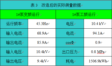 循環(huán)水泵變頻改造后,2017年3月,高壓變頻器一次性投入生產(chǎn),至今運(yùn)行正常。經(jīng)過廠節(jié)能服務(wù)中心測(cè)試,系統(tǒng)達(dá)到了預(yù)期的效果。水泵變頻改造后,循環(huán)水泵輸入電流有明顯下降,設(shè)備實(shí)現(xiàn)了軟起動(dòng),改善了設(shè)備的運(yùn)行工況,極大地減輕了設(shè)備起動(dòng)時(shí)對(duì)供配電系統(tǒng)的沖擊。改造前后1#給水泵工變頻運(yùn)行正常統(tǒng)計(jì)數(shù)據(jù)如表3所示。