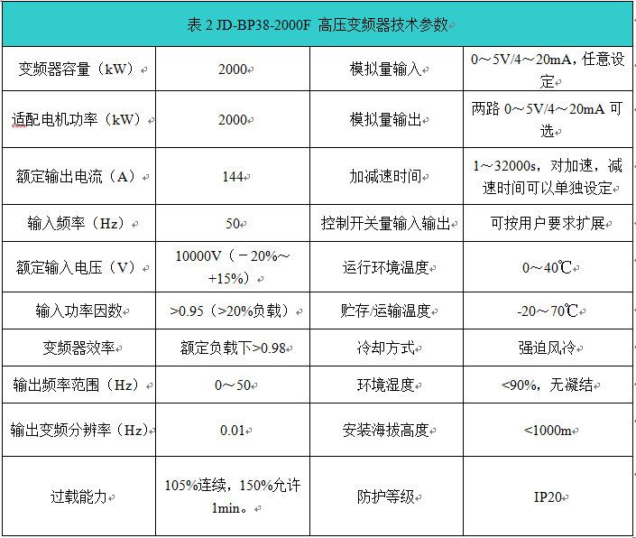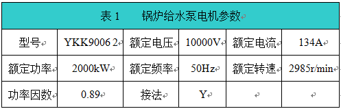 為了解決上述問題,經(jīng)過了大量的技術(shù)論證,邯鋼能源中心決定用高壓變頻器替代傳統(tǒng)的閥門調(diào)節(jié)給水量的方法。電機(jī)的穩(wěn)定運(yùn)轉(zhuǎn)對(duì)正常生產(chǎn)至關(guān)重要,對(duì)設(shè)備要求特別苛刻,因此在高壓變頻器的選用上非常謹(jǐn)慎。經(jīng)過考察對(duì)比,通過招標(biāo)方式,邯鋼能源中心選用了新風(fēng)光電子科技股份有限公司生產(chǎn)的高壓變頻器JD-BP38-2000F(2000 kW/10 kV)對(duì)2臺(tái)給水泵進(jìn)行變頻改造,采用一拖二方式。2臺(tái)給水泵電機(jī)和變頻器的技術(shù)參數(shù)如表1和表2所示。