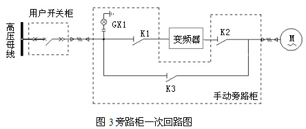 圖3手動旁路柜中,共有3個高壓隔離開關(guān),為了確保不向變頻器輸出端反送電,K2與K3采用電磁互鎖操動機(jī)構(gòu),實現(xiàn)電磁互鎖。當(dāng)K1、K2閉合,K3斷開時,電機(jī)變頻運行;當(dāng)K1、K2斷開,K3閉合時,電機(jī)工頻運行,此時變頻器從高壓中隔離出來,便于檢修、維護(hù)和調(diào)試。