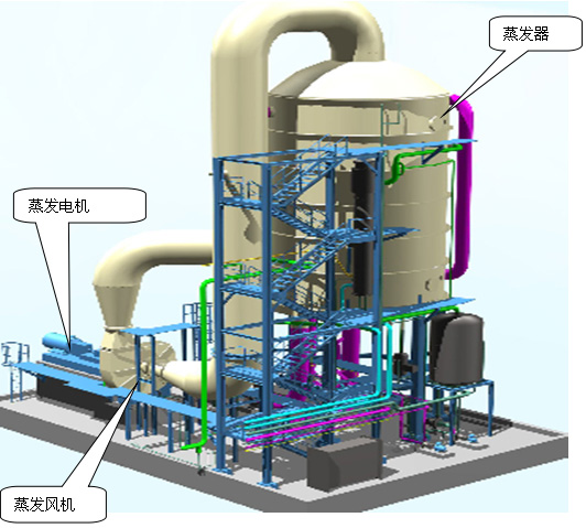 蒸發(fā)風(fēng)機(jī)的主要作用是將注入蒸發(fā)器的廢液蒸汽回收然后再送入散熱片中起到增壓升溫的作用,需要說明的是,在蒸發(fā)風(fēng)機(jī)開啟之前,需要補給新鮮蒸汽當(dāng)溫度達(dá)到96℃以上時就可以開啟蒸發(fā)風(fēng)機(jī),達(dá)到自循環(huán)關(guān)閉新鮮蒸汽起到節(jié)約的作用。其蒸發(fā)的冷凝液經(jīng)過冷卻后又可被回收利用,從而節(jié)約了清水資源。