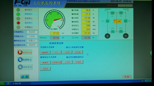 變頻調(diào)速系統(tǒng)操作方面,有遠(yuǎn)程控制和本地控制兩種控制的方式,這兩種控制方式可提高系統(tǒng)的安全性能。通過(guò)上位機(jī)對(duì)高壓變頻器運(yùn)行狀態(tài)進(jìn)行監(jiān)控,通過(guò)遠(yuǎn)控和本地對(duì)變頻器進(jìn)行控制,上位機(jī)監(jiān)控系統(tǒng)如圖1所示,具有以下功能:變頻啟動(dòng)、變頻停止、故障復(fù)位、變頻運(yùn)行指示、變頻停止指示、故障輸出、通訊指示,并可在上位機(jī)上顯示變頻器的運(yùn)行數(shù)據(jù)、設(shè)定壓力、反饋壓力和當(dāng)前狀態(tài),實(shí)時(shí)監(jiān)控系統(tǒng)運(yùn)行。