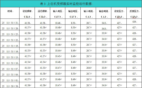 在上位機(jī)監(jiān)控系統(tǒng)具有豐富的功能。除了可以具有以下功能:變頻啟動(dòng)、變頻停止、故障復(fù)位外,還可以顯示變頻運(yùn)行指示、變頻停止指示、故障輸出、通訊指示等,并可在上位機(jī)上實(shí)時(shí)顯示變頻器的運(yùn)行數(shù)據(jù)、設(shè)定壓力、反饋壓力和當(dāng)前狀態(tài)。上位機(jī)變頻器實(shí)時(shí)監(jiān)控運(yùn)行數(shù)據(jù)如表3所示。