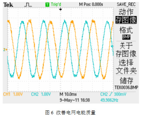 SVG 對諧波具有濾除功能,現(xiàn)場投入SVG 之后電網(wǎng)接入點電流諧波含量維持2%以下,SVG 與普通的無功補償裝置相比具有極快的響應(yīng)速度,F(xiàn)GSVG 響應(yīng)速度小于5ms,對于電網(wǎng)電壓的跌落和閃變具有一定抑制作用并網(wǎng)波形(如圖6所示):