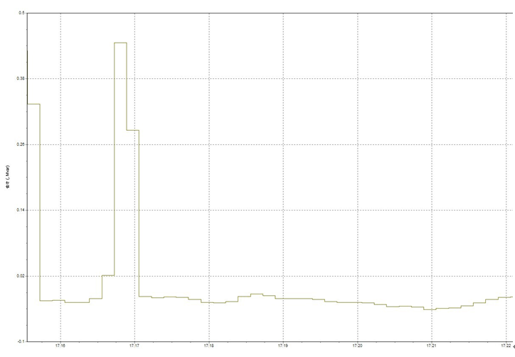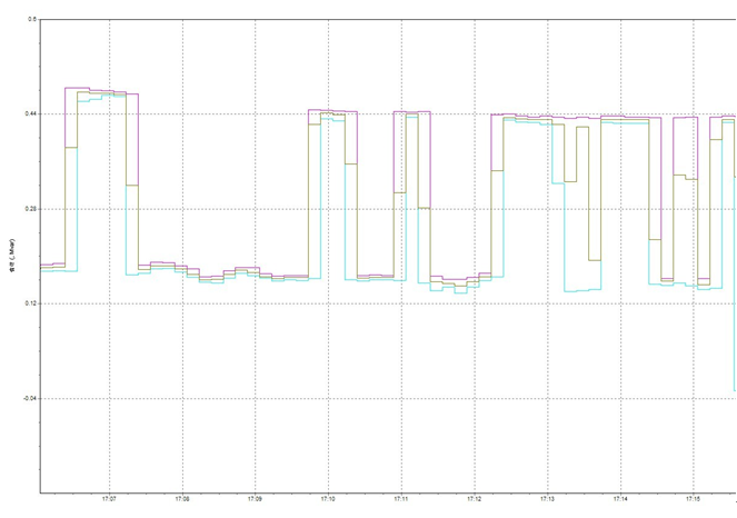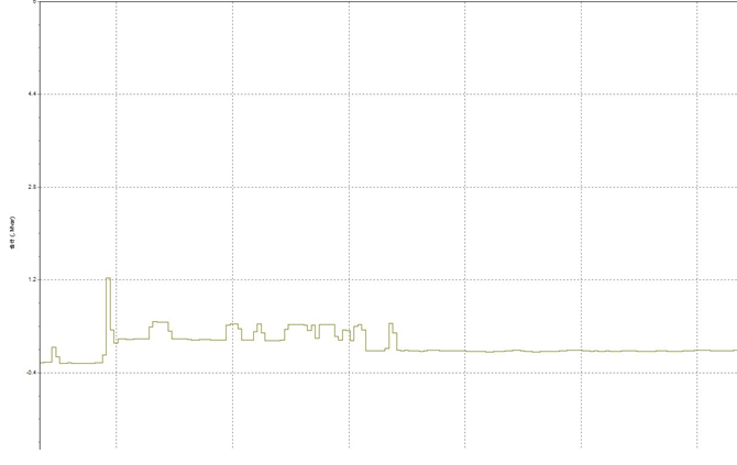 圖7左半部分為SVG未投運時系統(tǒng)無功值,最大可以到0.45Mvar,且波動較大,右半部分為SVG投運后系統(tǒng)無功值,可以看出無功補償投運后系統(tǒng)的無功值近乎為0,且波動較小,由此可以看出SVG對補償系統(tǒng)無功,提高線路供電能力有顯著地效果。
