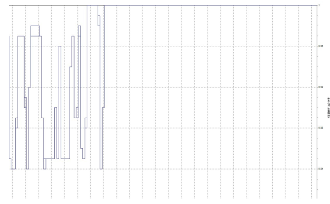 圖8是記錄的10kv1段直新線上的SVG投運前后系統(tǒng)的功率因數(shù)曲線,左半部分是投運前,可以看出功率因數(shù)較低,波動較大;右半部分為SVG投運后的功率因數(shù),可以看出功率因數(shù)為1,可見SVG對改善功率因數(shù)效果顯著。